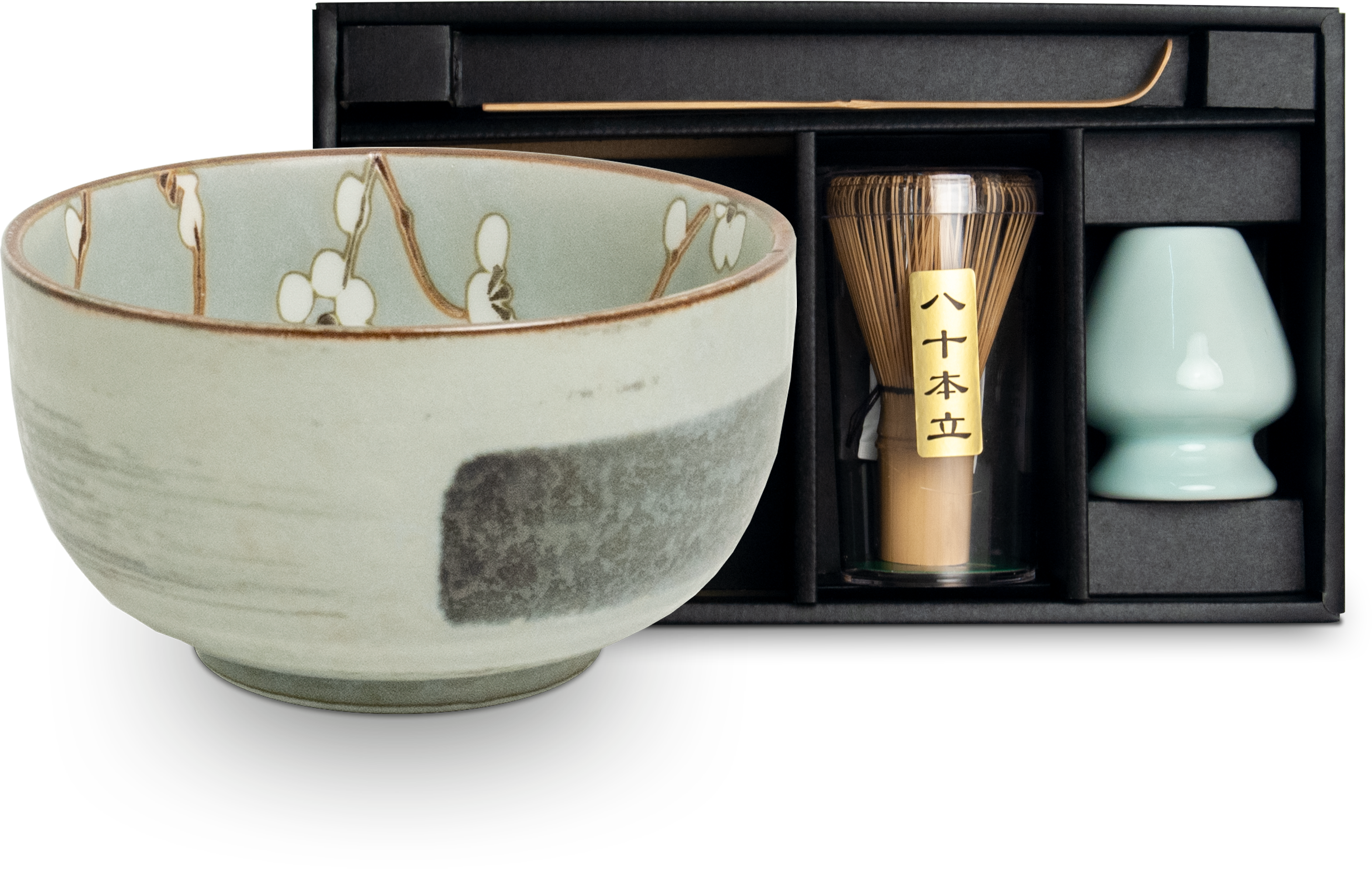 Dieses Matchaset besteht aus einer wunderschönen Keramikschale, einem Matchabesen, dem Portionierlöffel aus Bambus und dem Besenständer zum Trocknen des Besens.